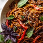 - Combine and Finish: Stir in the cooked noodles and the sautéed vegetables. Cook together for 2-3 minutes until the sauce evenly coats everything. Remove from heat, then stir in fresh basil and toasted sesame seeds just before serving.