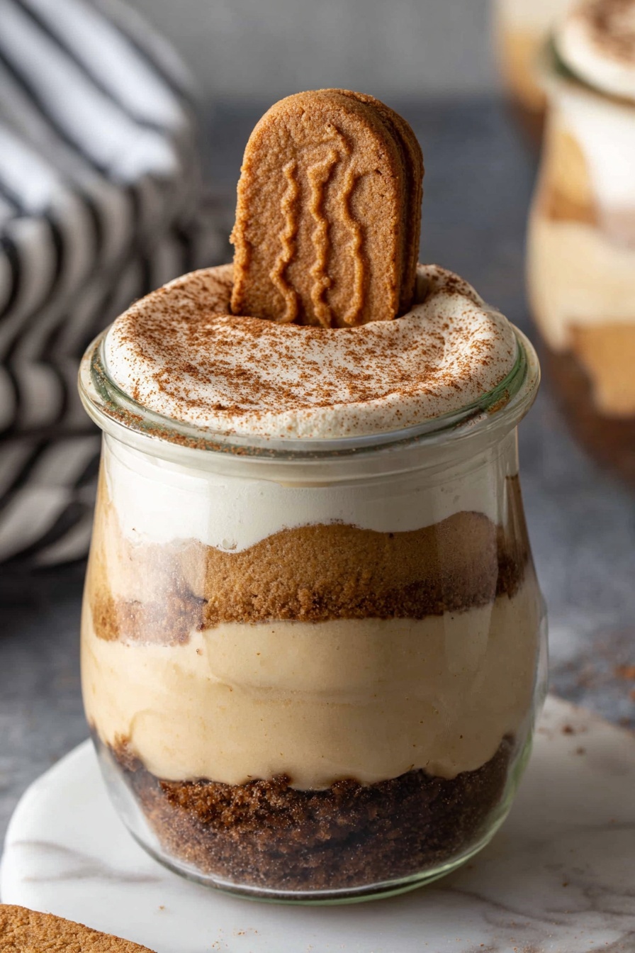 - Assemble Individual Biscoff Tiramisu Cups: For smaller servings, layer coffee-dipped Biscoff cookies in 7-oz dessert cups. Use a piping bag to pipe the cream mixture in layers between cookies. Dust with cocoa powder and chill until serving. Garnish with a Biscoff cookie placed at an angle.