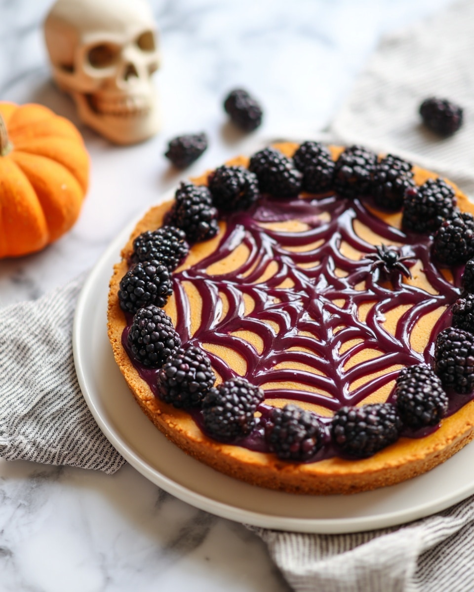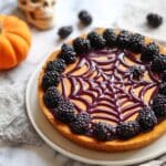 I personally love keeping the garnishes simple to let the tart shine. Fresh halved blackberries around the edge give a burst of color and freshness. Sometimes I sprinkle a tiny pinch of cinnamon or a dusting of powdered sugar on top just before serving. And for a festive touch, little chocolate “spider legs” piped on blackberries are fun and delightful for holiday treats.