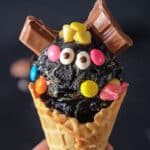 This Boo Batter Ice Cream is a no-churn, fun and spooky treat perfect for Halloween or any celebration. Combining a rich cake batter flavor with bits of Kit Kat and Oreo cookies, this black-hued ice cream is garnished with candy corn, candy eyes, and smarties, making it as festive as it is delicious. Easy to prepare and requiring only a few hours in the freezer, it’s a perfect homemade ice cream for those without an ice cream maker.