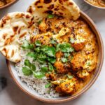 A flavorful Indian-inspired Butter Cauliflower recipe featuring tender cauliflower florets cooked in a spiced tomato cream sauce, perfect served over basmati rice and garnished with fresh cilantro and Greek yogurt.