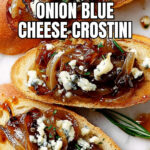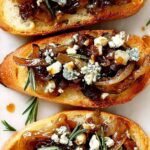 Delightful Caramelized Onion Crostini topped with sweet fig jam and tangy blue cheese, garnished with fresh rosemary and black pepper. Perfect as an appetizer for gatherings or a sophisticated snack.