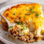 Cattle Drive Casserole is a delicious layered comfort dish featuring a cheddar biscuit base topped with seasoned ground beef, a creamy cheese blend, and melted cheddar cheese. Perfect for a hearty family meal, this easy casserole combines savory flavors with a cheesy, golden crust.
