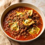 This hearty and comforting Ravioli Soup features tender cheese ravioli simmered in a flavorful beef and tomato broth, seasoned with garlic, basil, and oregano. Perfect for a cozy dinner, it combines the richness of ground beef with aromatic herbs and a touch of Parmesan cheese for added depth.