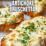 Artichoke Bruschetta is a creamy, cheesy appetizer featuring a blend of cream cheese, mayonnaise, artichoke hearts, Parmesan, and mozzarella spread atop crusty baguette slices. Broiled until bubbly and golden, it makes a savory, crowd-pleasing starter perfect for gatherings.