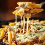 A creamy and comforting Cheesy Penne with Garlic Butter Ground Beef, featuring al dente penne pasta tossed in a savory garlic butter sauce with seasoned ground beef and melted mozzarella and Parmesan cheeses, garnished with fresh parsley for a flavorful and hearty meal.