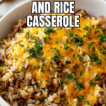 A comforting Cheesy Ground Beef and Rice Casserole featuring tender ground beef, flavorful cream sauce, and melted cheddar cheese baked to golden perfection. Ideal for an easy and hearty family meal.