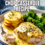 A hearty pork chop and potato casserole featuring seared pork chops layered over thinly sliced potatoes and onions, baked in a creamy mushroom soup mixture and topped with melted cheddar cheese for a comforting and satisfying meal.