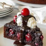 A rich and moist Chocolate Cherry Upside Down Cake featuring a luscious layer of fresh or frozen cherries topped with a decadent chocolate cake batter, baked to perfection and served warm or cold.