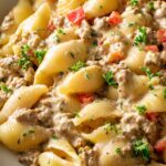 - Combine Pasta and Sauce: Stir the cooked pasta shells into the creamy beef sauce, ensuring everything is well coated.