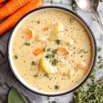 This creamy chicken soup is a comforting and hearty meal perfect for any season. It combines tender shredded chicken, aromatic herbs, and a rich creamy broth made with butter, fresh vegetables, and heavy cream, resulting in a flavorful and satisfying dish.
