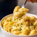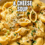 A rich and comforting Mac & Cheese Soup featuring tender pasta shells simmered in a creamy, cheesy broth made with cheddar, cream cheese, and aromatic vegetables. Perfect as a hearty meal topped with fresh chives, green onions, or crispy bacon crumbles.