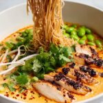 Creamy Marry Me Chicken Ramen is a flavorful and comforting dish featuring tender pan-fried chicken breasts cooked in a rich, creamy broth infused with garlic, sun-dried tomatoes, smoked paprika, and parmesan cheese. Served with perfectly cooked ramen noodles and vibrant toppings like fresh cilantro, bean sprouts, edamame beans, scallions, and a drizzle of chili oil, this recipe delivers a delicious fusion of creamy richness and spicy warmth perfect for a satisfying meal.