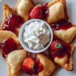 Delightfully crispy deep-fried wonton bites stuffed with creamy strawberry cheesecake filling, perfect for a sweet snack or dessert. These irresistible treats combine smooth cream cheese, sweet strawberry jam, and fresh strawberries encased in crispy wonton wrappers, served with whipped cream and extra strawberry sauce.