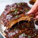 For special occasions, I like to serve the ribs family-style on a big wooden board surrounded by little bowls of extra BBQ sauce, pickles, and jalapeños. It turns dinner into a fun, interactive experience that everyone enjoys digging into.