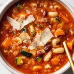 A hearty and comforting Minestrone Soup packed with fresh vegetables, beans, and elbow macaroni simmered in a flavorful tomato broth, perfect for a nutritious and satisfying meal.