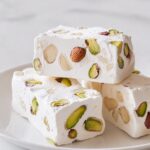 Traditional Italian Torrone is a soft white nougat candy packed with toasted nuts and sweetened with honey and sugar syrup. This classic recipe combines fluffy whipped egg whites with toasted almonds and pistachios, flavored with vanilla or citrus zest, to create a chewy, nutty confection perfect for festive occasions or indulgent treats.