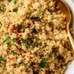 A simple and flavorful 5-ingredient garlic butter quinoa recipe that’s perfect as a nutritious side dish. Made with quinoa cooked in vegetable broth, infused with vegan or regular butter and garlic powder, this dish is quick and easy to prepare in under 20 minutes.