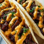 Delicious Garlic Butter Honey BBQ Tacos featuring tender beef cooked in a flavorful garlic butter honey BBQ sauce, topped with a creamy smoky taco sauce, cheddar cheese, and fresh cilantro wrapped in soft tortillas.