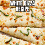 This White Pizza with Garlic Pizza Sauce features a creamy, garlicky white sauce topped with mozzarella and parmesan cheeses on a crispy crust, garnished with fresh basil for a flavorful and easy-to-make pizza perfect for any pizza lover.