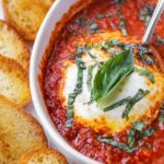 A warm and creamy Goat Cheese & Marinara Dip perfect for serving with crostini or crisp crackers. This easy baked appetizer combines tangy goat cheese, cream cheese, Parmesan, and a flavorful marinara sauce, topped with fresh basil ribbons for garnish.