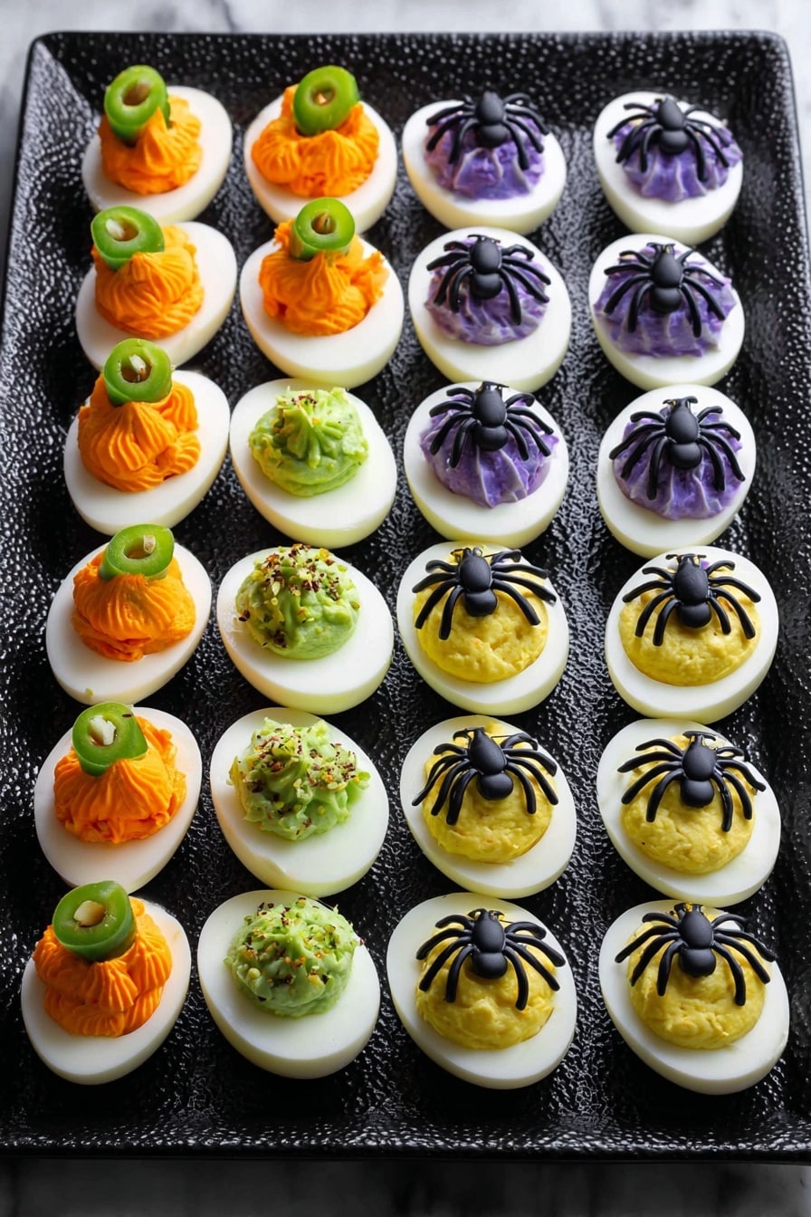 Fill each egg white half with its colored yolk mixture. Now the fun begins—decorate! For “eyeballs,” I slice pimento-stuffed green olives and pop them right on top; for “pumpkins,” I use a toothpick to draw lines in the orange filling and add a parsley stem. Sprinkle black sesame seeds on the green ones and craft creepy “spiders” from sliced black olives for the last batch.