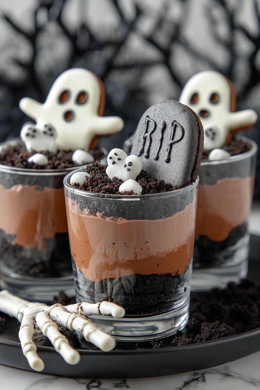 - Decorate Cups: Before serving, gently press a Milano cookie tombstone into each cup, place a white chocolate ghost next to it, and position a candy tree at the back. Sprinkle with Halloween sprinkles if desired.