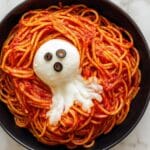 I love that this Halloween Spaghetti with Burrata Ghosts Recipe is super flexible and leaves room for your own flair. Sometimes I swap the tomato base for pesto, or I change up the “ghost faces” with different fun toppings depending on what I have on hand.