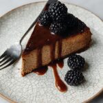 A rich and creamy Basque-style cheesecake infused with the nutty, roasted flavors of hojicha tea. This decadent dessert features a deeply caramelized top, a silky texture, and is perfectly complemented by fresh blackberries and hojicha caramel for serving.