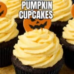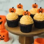 These Jack-O-Lantern Halloween Pumpkin Cupcakes are a festive and delicious treat featuring moist pumpkin cupcakes filled with salted caramel sauce, topped with creamy pumpkin buttercream and adorable hand-crafted fondant pumpkin decorations. Perfect for Halloween parties and fall celebrations.
