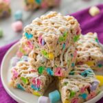 Delightfully sweet and colorful Lucky Charms Treats combining crispy cereal with gooey marshmallows and a hint of vanilla. These no-bake treats are easy to make and perfect for a fun snack or party dessert.