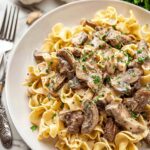 For special occasions, I’ve served this stroganoff in individual cast iron skillets—guests love the rustic vibe and it keeps things warm. You can also layer it over wild rice pilaf in shallow bowls for a fancy touch. Another fun twist? Use different pasta shapes like pappardelle or even gluten-free noodles if you want to impress friends with dietary needs.