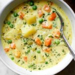 Polish Dill Soup is a comforting and flavorful traditional soup featuring tender potatoes, carrots, and green peas simmered in a seasoned chicken broth with aromatic spices like marjoram and turmeric. Finished with creamy sour cream and fresh dill, this soup offers a rich and hearty taste perfect for any meal.