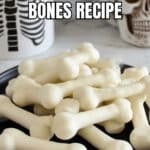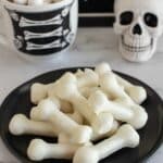 I like arranging these bones in a fun skeleton shape on a platter for Halloween, or sticking them upright in a creepy “bone jar” filled with black beans or rice to hold them in place. Wrapping individual bones in cellophane with a little orange ribbon makes charming party favors kids adore.
