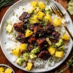 - Serve: Plate the coconut rice topped with the glazed pineapple chicken. Spoon pineapple salsa over the chicken, sprinkle with diced avocado, and add a squeeze of fresh lime for extra brightness.