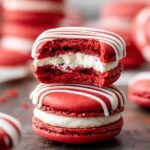 Indulge in these elegant Red Velvet Macarons, featuring delicate almond flour shells infused with rich Dutch-process cocoa powder and vibrant red gel food coloring, paired with a smooth and creamy cream cheese frosting filling. Perfect for special occasions or as a luxurious treat.
