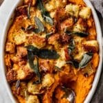 I love how versatile this Savory Sweet Potato Casserole with Sage, Parmesan, and Crispy Bread Topping Recipe is—you can easily personalize it to suit your mood or diet. Sometimes I switch up herbs or even swap bread types to suit what I have on hand. Don’t hesitate to make it your own!
