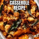 A savory sweet potato casserole featuring roasted sweet potatoes blended with shallots, mayonnaise, Parmesan, Dijon mustard, and spices, topped with crispy sage and toasted sourdough breadcrumbs for a flavorful and comforting side dish perfect for holiday meals.