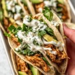 - Build the Tacos: Warm the flour tortillas. Layer shredded romaine, sliced avocado, and the shredded chicken mixture into each tortilla. Top with crumbled feta cheese and drizzle with the creamy chimichurri sauce. Serve warm.