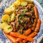 After that initial cook, I add the remaining potatoes, carrots, and onions over the roast in the slow cooker. Then back goes the lid for another 3-4 hours or until everything is fork-tender. It’s always a delight checking in and seeing those perfectly cooked veggies nestled in the beautifully softened beef.