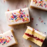 Delicious Poptart Cookie Bars featuring layers of buttery sugar cookie dough filled with sweet strawberry preserves and topped with a vanilla glaze and colorful sprinkles. Perfect for a fun dessert or snack that combines the nostalgic flavors of poptarts in an easy-to-make bar form.