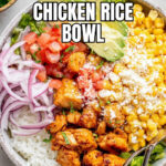 Delicious and flavorful Street Corn Chicken Rice Bowls featuring tender, spiced chicken, creamy street corn topping, and fragrant cilantro lime rice. This colorful bowl combines a variety of textures and zesty flavors, perfect for a quick and satisfying dinner.