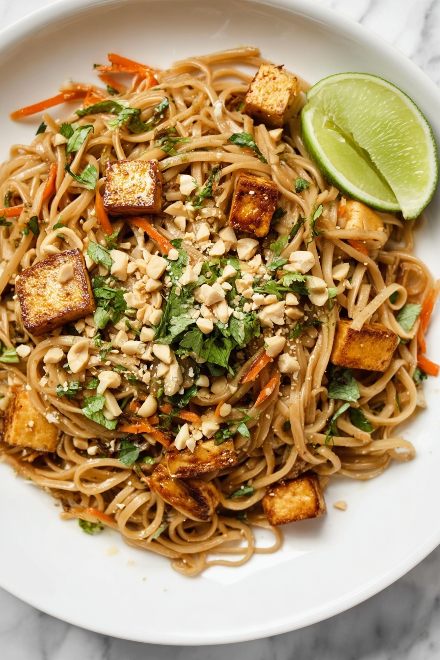 For dinner parties, I love serving Vegan Pad Thai in individual coconut bowls with extra garnishes like sliced red chili or fresh Thai basil leaves. It instantly feels festive and transports you to a street market in Bangkok. I’ve also tried it wrapped in lettuce cups for a handheld fun twist.