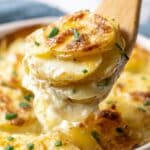 Absolutely! While Yukon Golds offer a creamy and buttery texture that’s perfect for scalloped potatoes, russets or even sweet potatoes work well too. Just keep in mind that thicker or starchier potatoes might need a longer bake time, so test for doneness before serving.