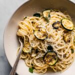 - Toss Pasta and Zucchini: Transfer the cooked spaghetti to a large skillet over medium-low heat. Add the zucchini mixture and gradually add reserved pasta water to reach a creamy sauce consistency, tossing gently to combine.